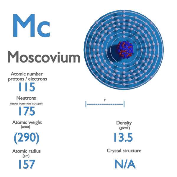 O elemento 115 (moscóvio) foi descoberto e produzido oficialmente pela primeira vez em 2003 pelo Instituto de Tecnologia de Moscou, Rússia.